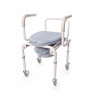 Кресло-стул с санитарным оснащением пассивного типа. Благодаря специальной конструкции рамы данное кресло-стул можно использовать в стандартных туалетных комнатах. Эта модель оснащена откидными подлокотниками.